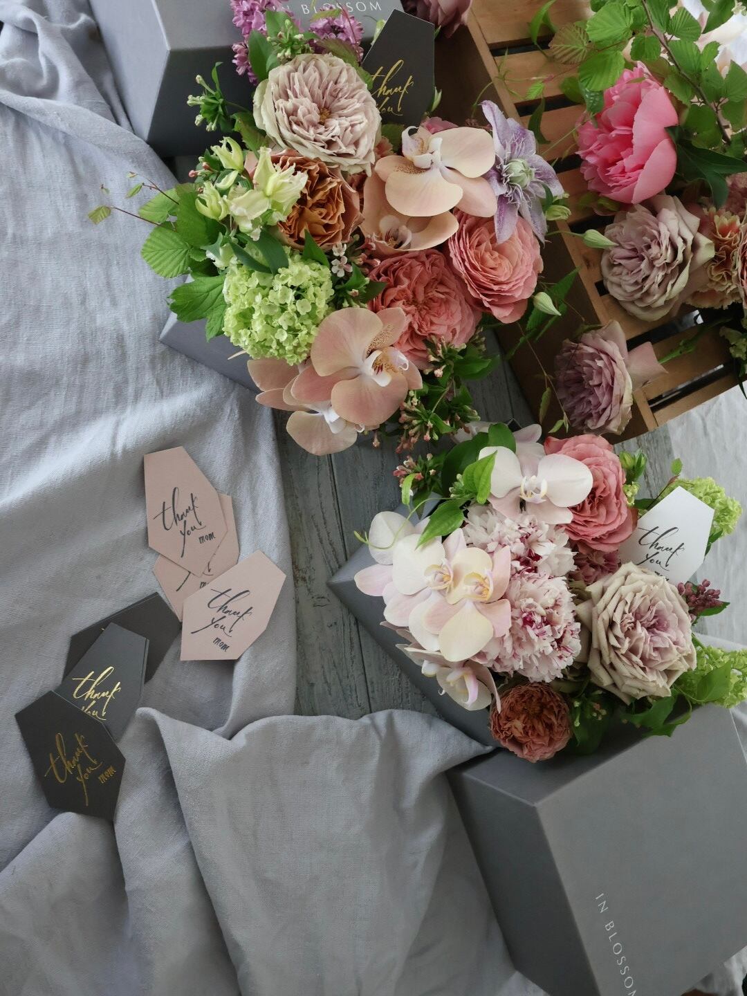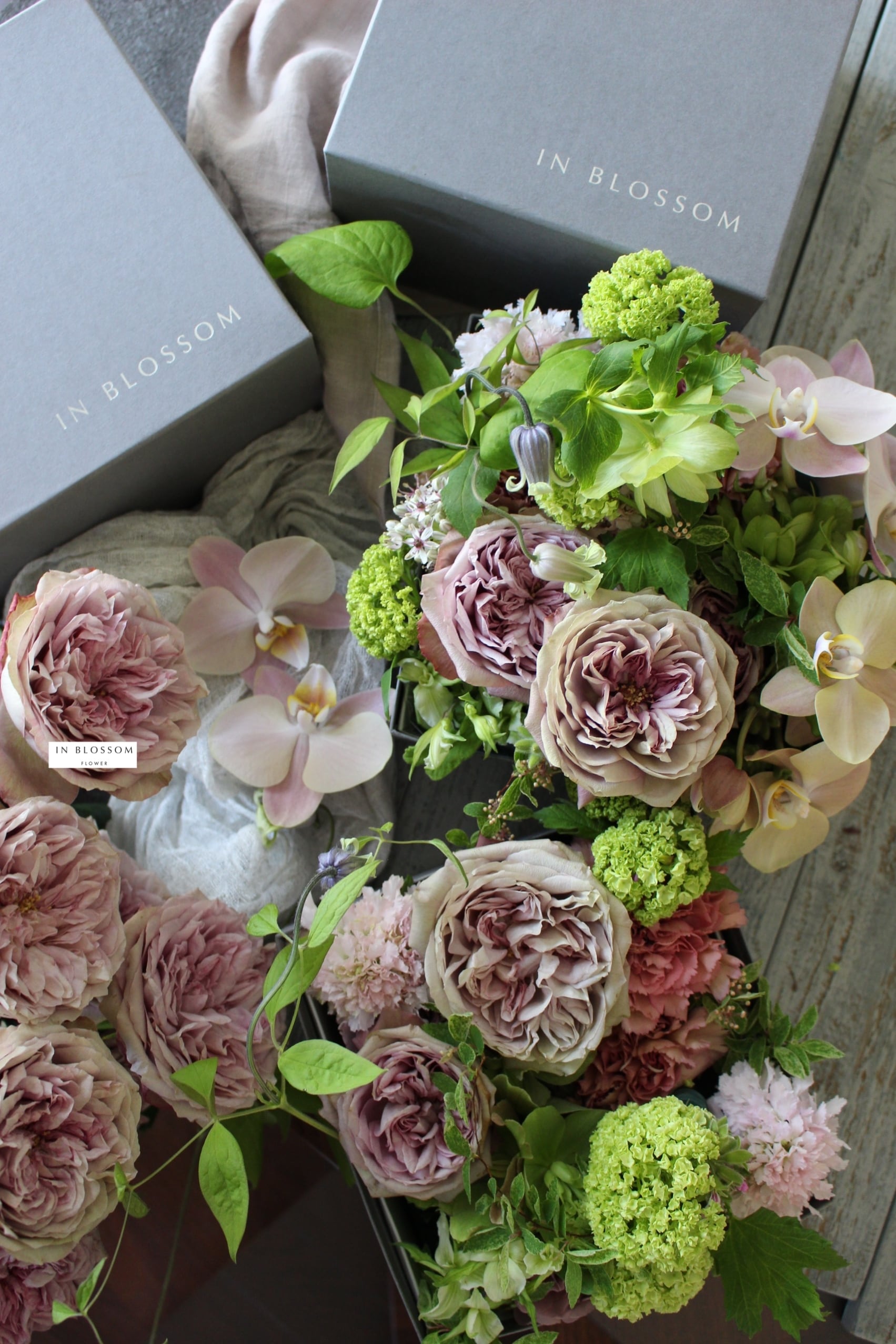 IN BLOSSOM オリジナルボックスに堀木園芸のバラ、厳選花材、希少花材をコンパクトにアレンジしてお届けいたします。